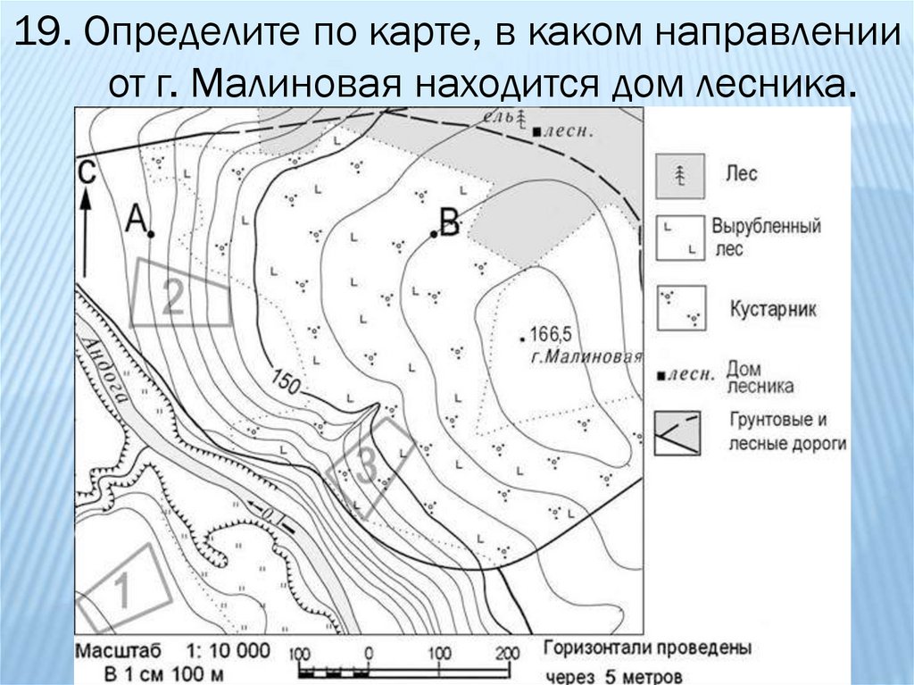 19. Определите по карте, в каком направленииот г. Малиновая находится дом лесника.