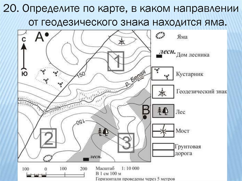 20. Определите по карте, в каком направленииот геодезического знака находится яма.