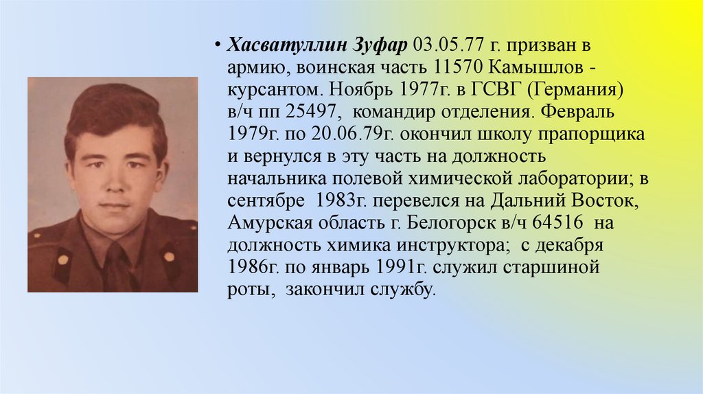 • Хасватуллин Зуфар 03.05.77 г. призван вармию, воинская часть 11570 Камышлов курсантом. Ноябрь 1977г. в ГСВГ (Германия)