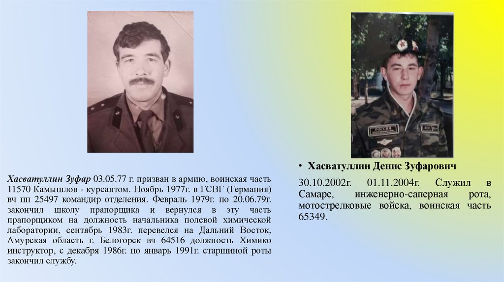 • Хасватуллин Денис ЗуфаровичХасватуллин Зуфар 03.05.77 г. призван в армию, воинская часть