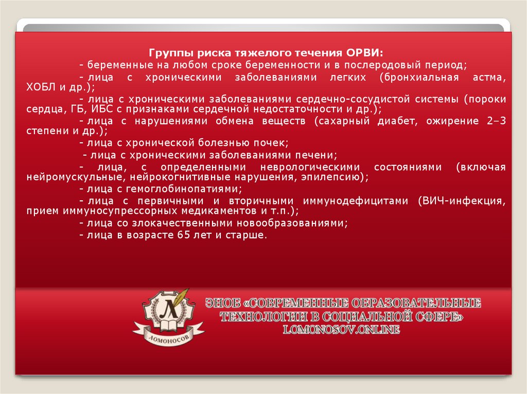 Группы риска тяжелого течения ОРВИ:- беременные на любом сроке беременности и в послеродовый период;