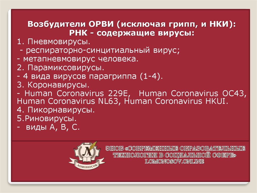 Возбудители ОРВИ (исключая грипп, и НКИ):РНК - содержащие вирусы: