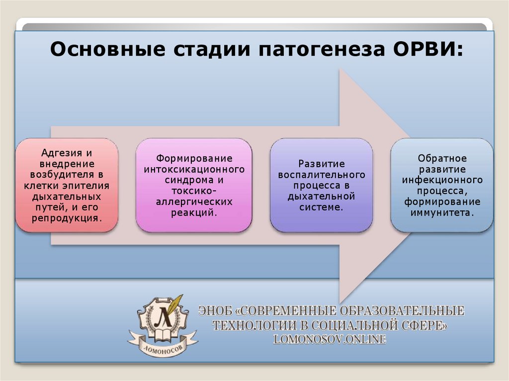 Основные стадии патогенеза ОРВИ:Адгезия и