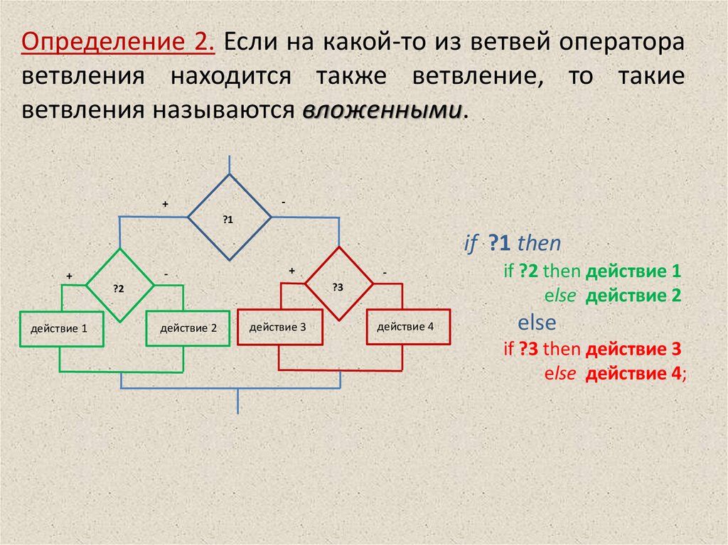 Определение 2. Если на какой-то из ветвей оператораветвления находится также ветвление, то такие