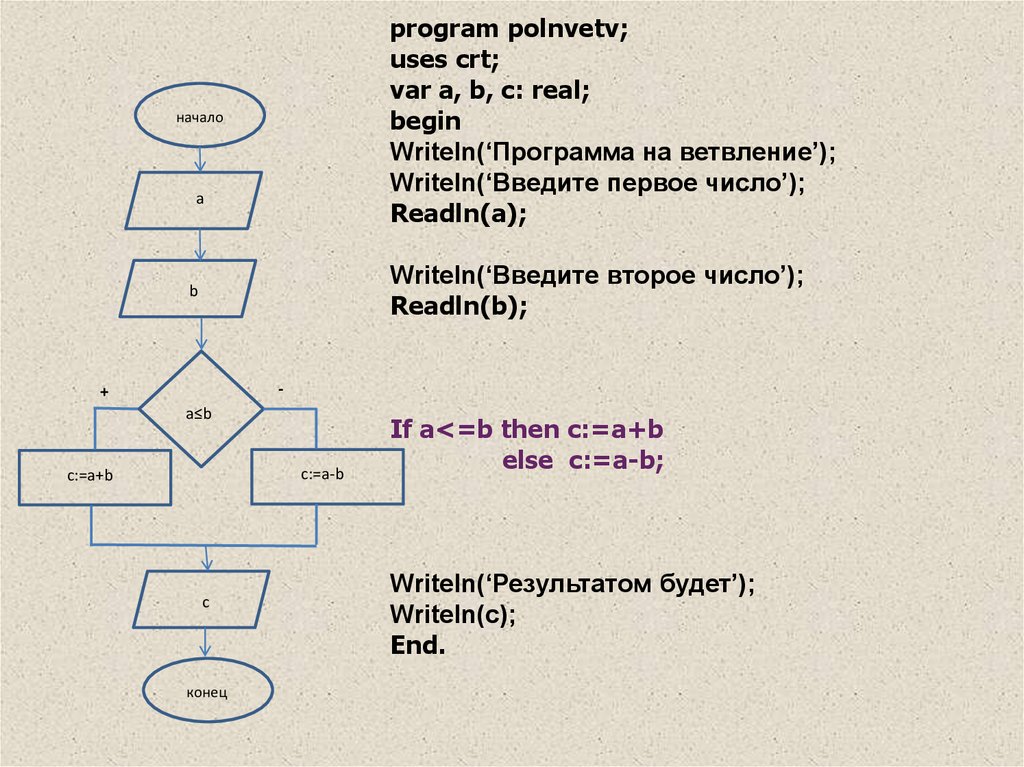 Задача. Вычислить значение величины с, определяемое поформулам: c=a+b, если a≤b и c=a-b, если a>b.