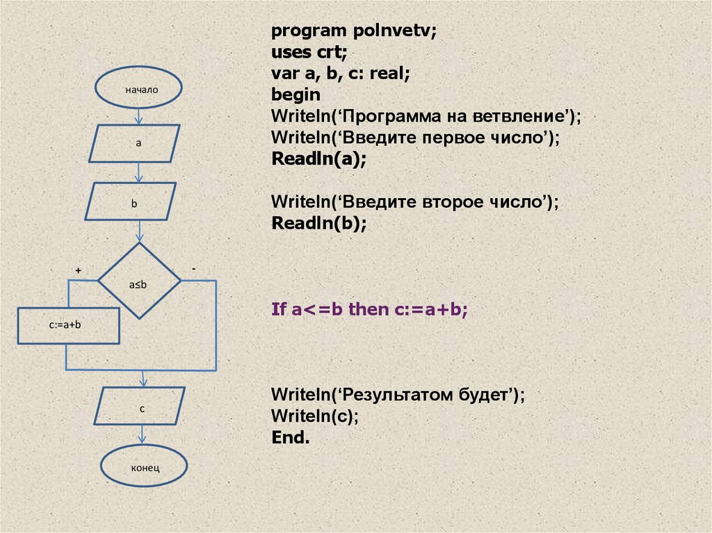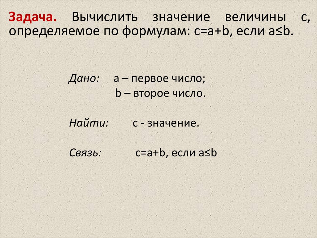 Задача. Вычислить значение величины с,определяемое по формулам: c=a+b, если a≤b.
