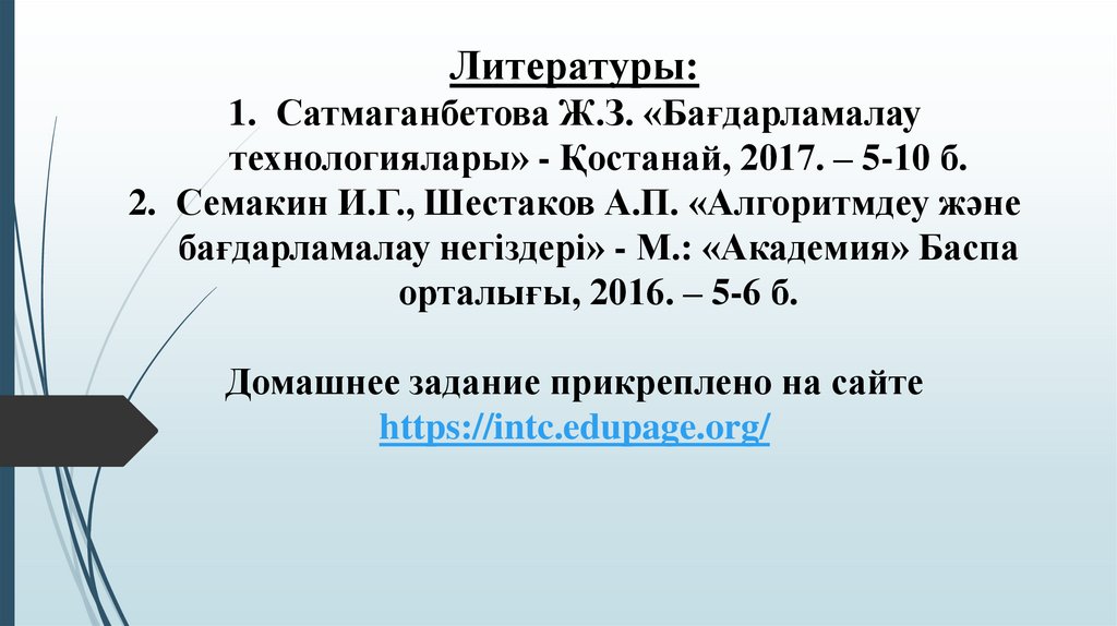 Литературы:1. Сатмаганбетова Ж.З. «Бағдарламалау