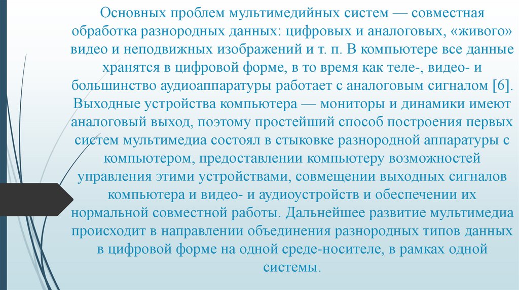 Основных проблем мультимедийных систем — совместнаяобработка разнородных данных: цифровых и аналоговых, «живого»