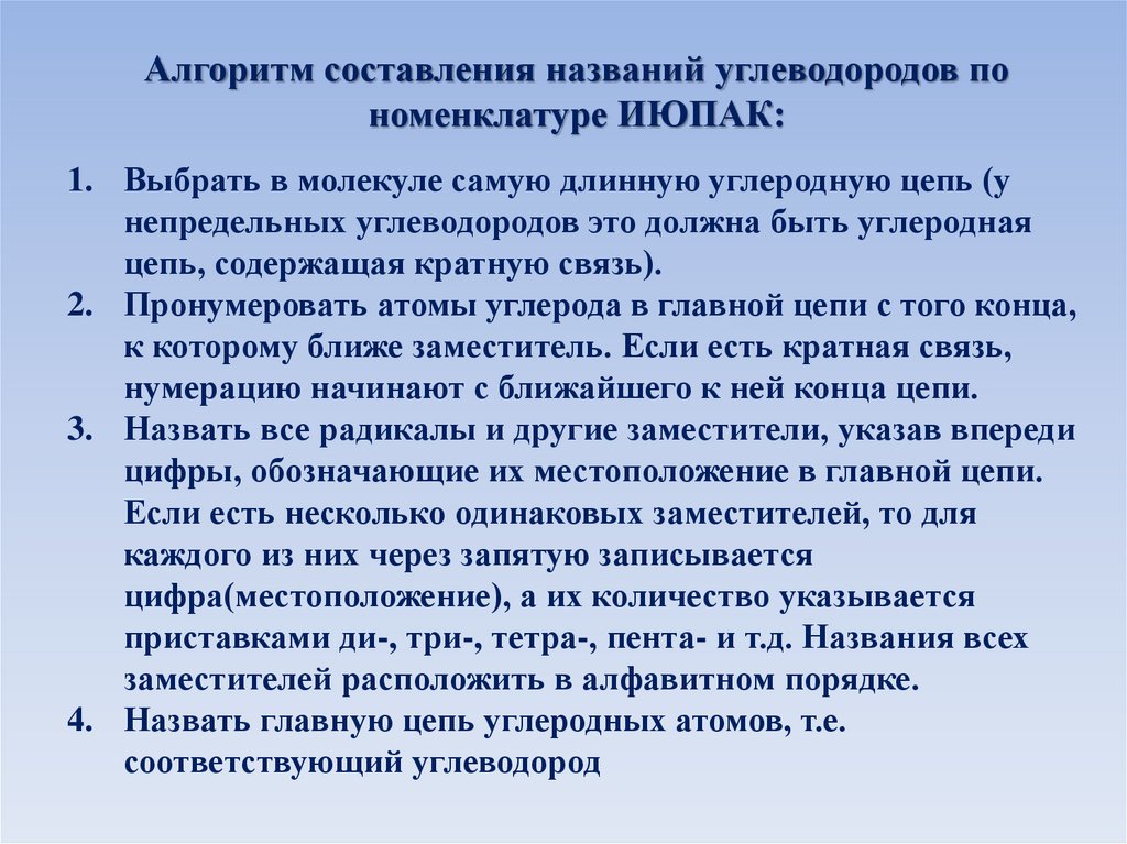 Алгоритм составления названий углеводородов пономенклатуре ИЮПАК: