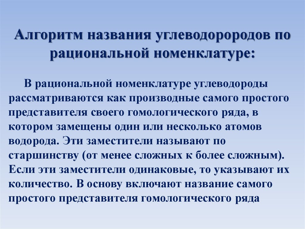 Алгоритм названия углеводорородов порациональной номенклатуре: