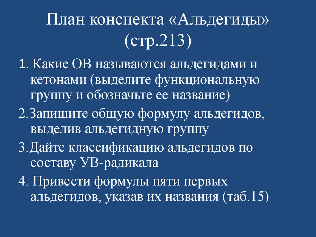 План конспекта «Альдегиды»(стр.213)