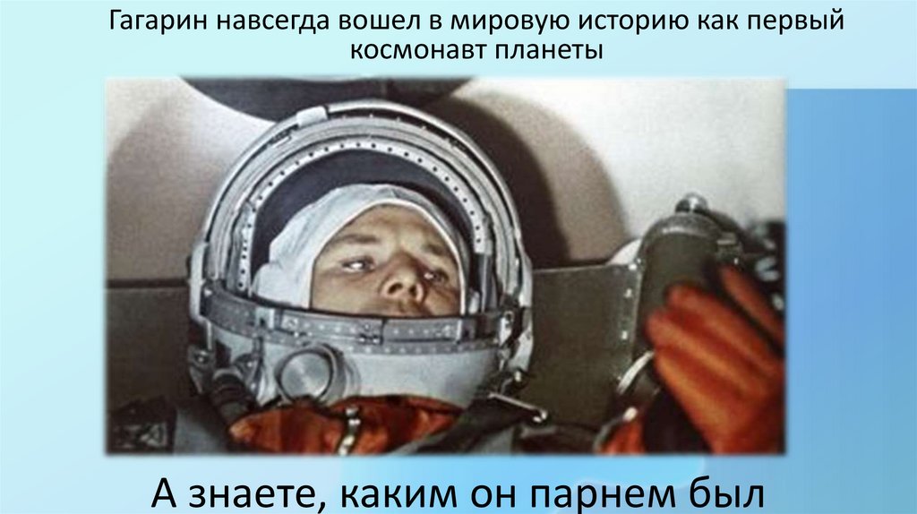 Гагарин навсегда вошел в мировую историю как первыйкосмонавт планеты