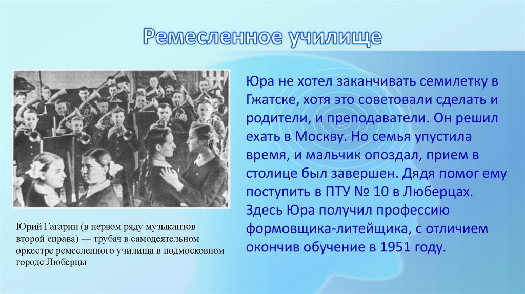 Юрий Гагарин (в первом ряду музыкантоввторой справа) — трубач в самодеятельном