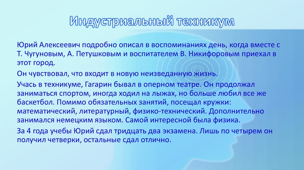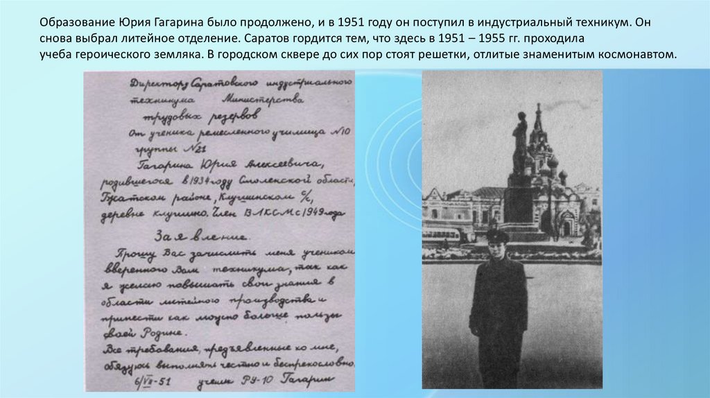 Образование Юрия Гагарина было продолжено, и в 1951 году он поступил в индустриальный техникум. Онснова выбрал литейное отделение. Саратов гордится тем, что здесь в 1951 – 1955 гг. проходила