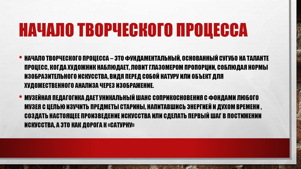 НАЧАЛО ТВОРЧЕСКОГО ПРОЦЕССА• НАЧАЛО ТВОРЧЕСКОГО ПРОЦЕССА – ЭТО ФУНДАМЕНТАЛЬНЫЙ, ОСНОВАННЫЙ СУГУБО НА ТАЛАНТЕ