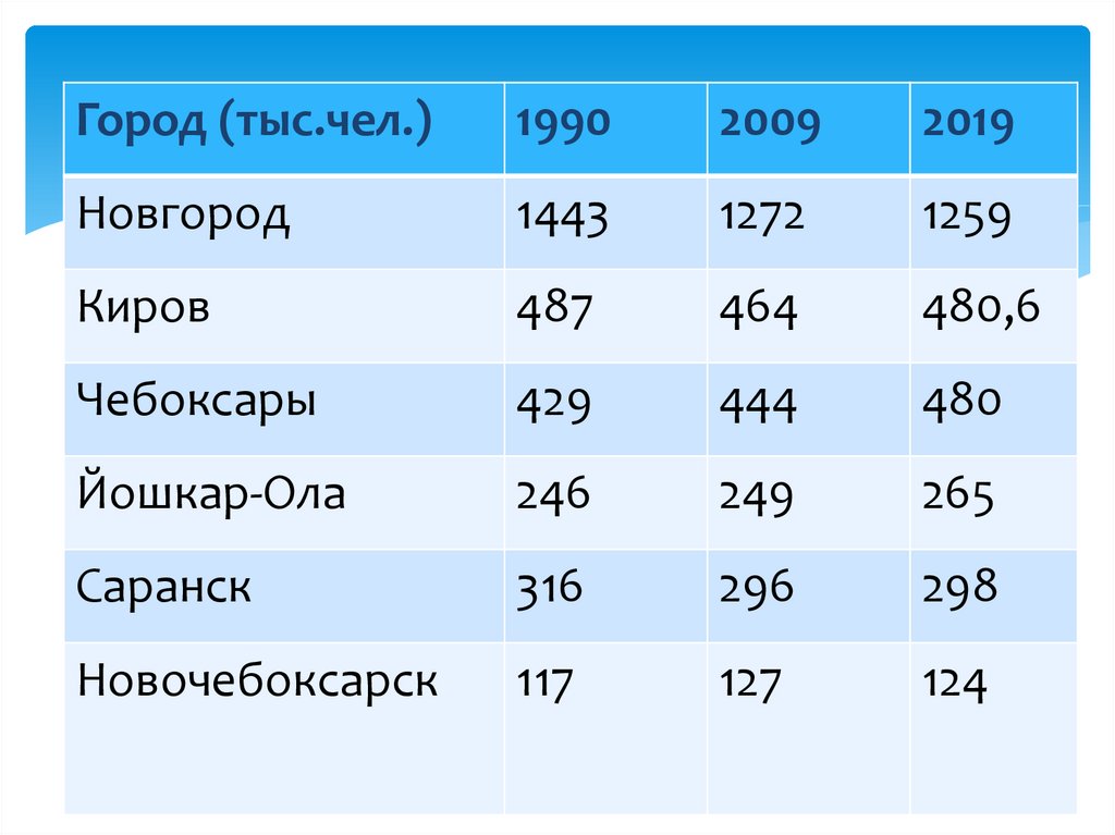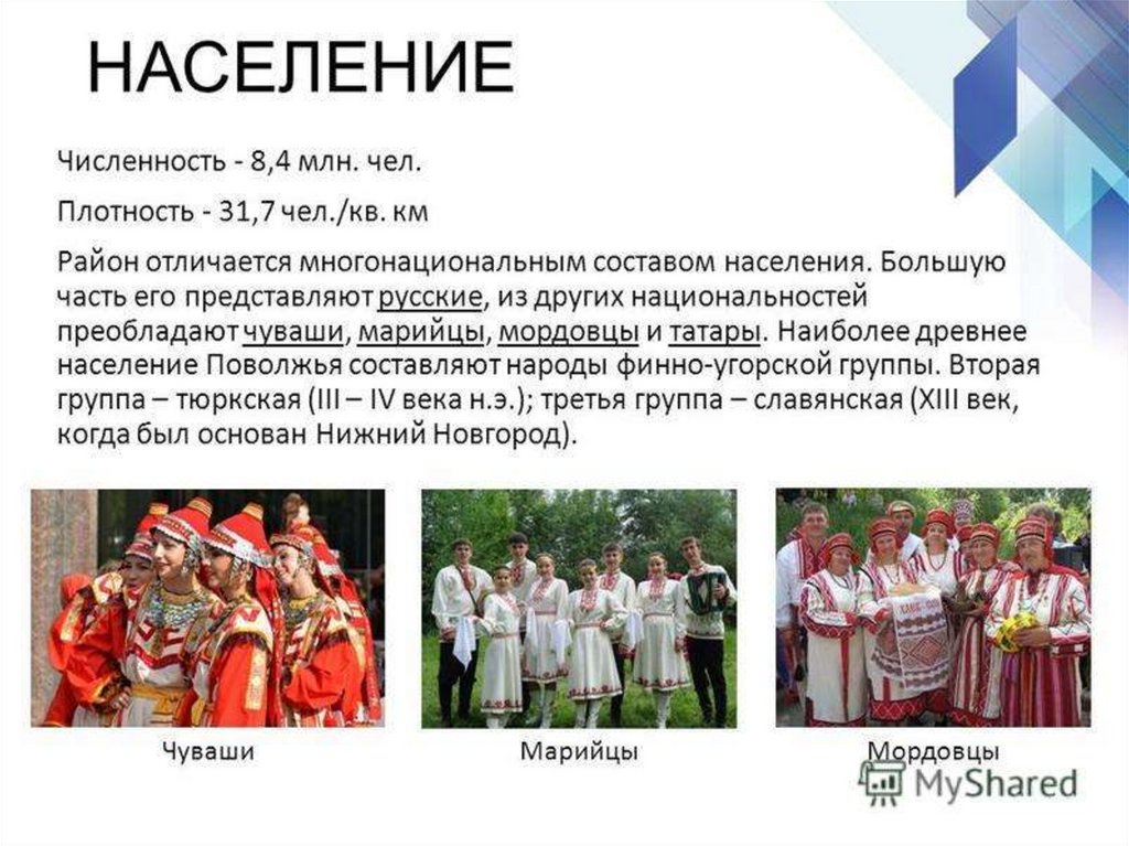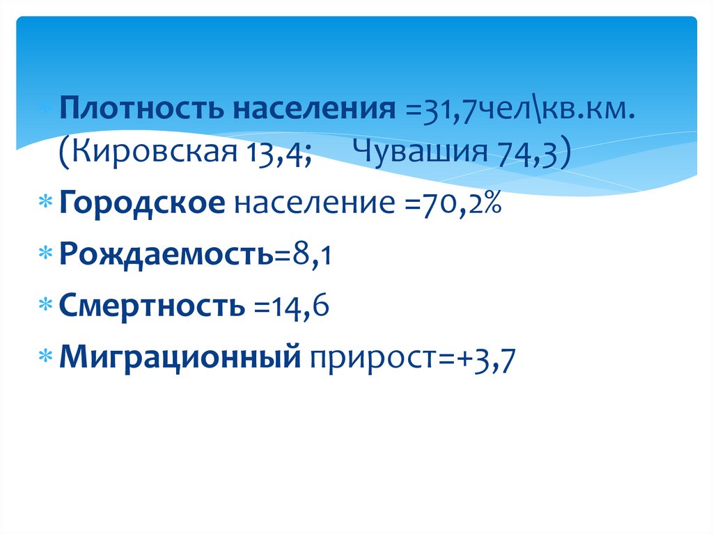 Плотность населения =31,7чел\кв.км.(Кировская 13,4; Чувашия 74,3)