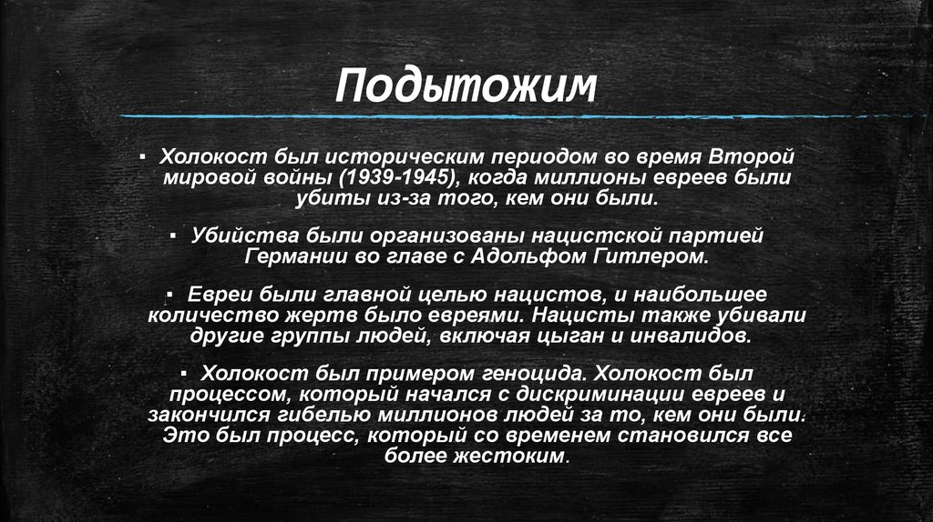 Подытожим▪ Холокост был историческим периодом во время Второй