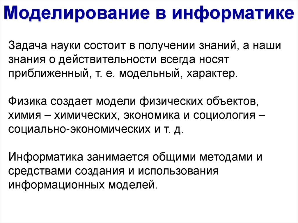 Моделирование в информатикеЗадача науки состоит в получении знаний, а наши
