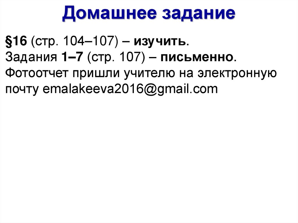 Домашнее задание§16 (стр. 104–107) – изучить.