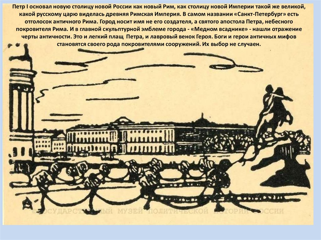 Петр I основал новую столицу новой России как новый Рим, как столицу новой Империи такой же великой,какой русскому царю виделась древняя Римская Империя. В самом названии «Санкт-Петербург» есть