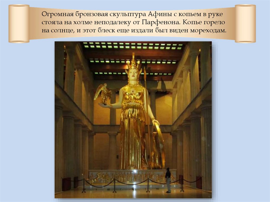 Огромная бронзовая скульптура Афины с копьем в рукестояла на холме неподалеку от Парфенона. Копье горело