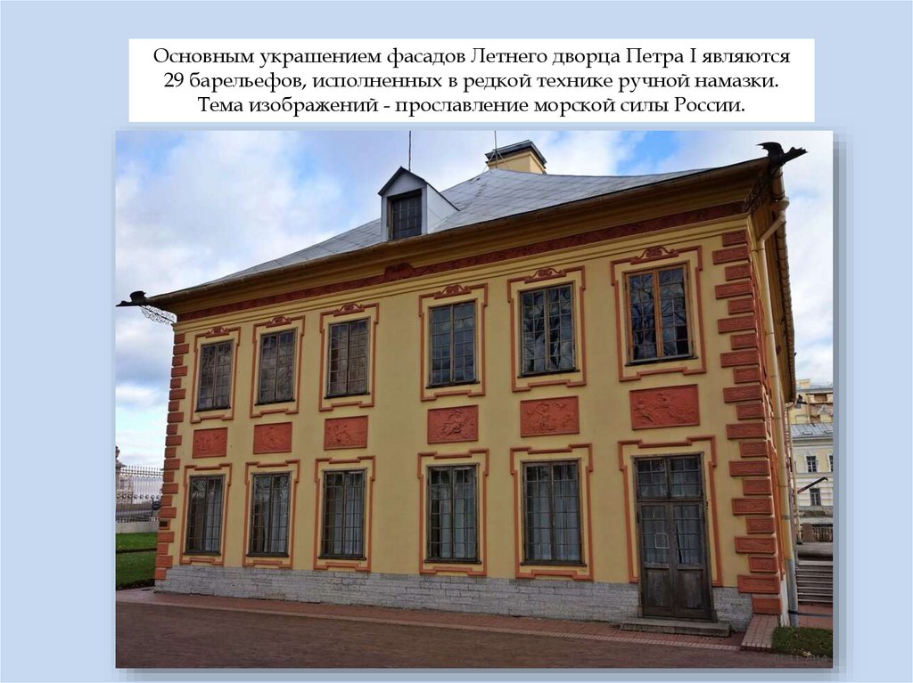 Основным украшением фасадов Летнего дворца Петра I являются29 барельефов, исполненных в редкой технике ручной намазки.