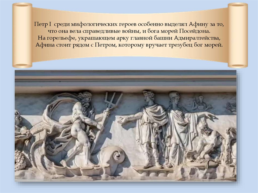 Петр I среди мифологических героев особенно выделял Афину за то,что она вела справедливые войны, и бога морей Посейдона.