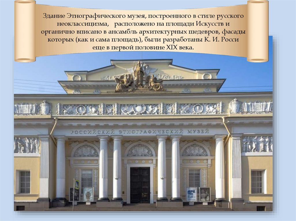 Здание Этнографического музея, построенного в стиле русскогонеоклассицизма, расположено на площади Искусств и