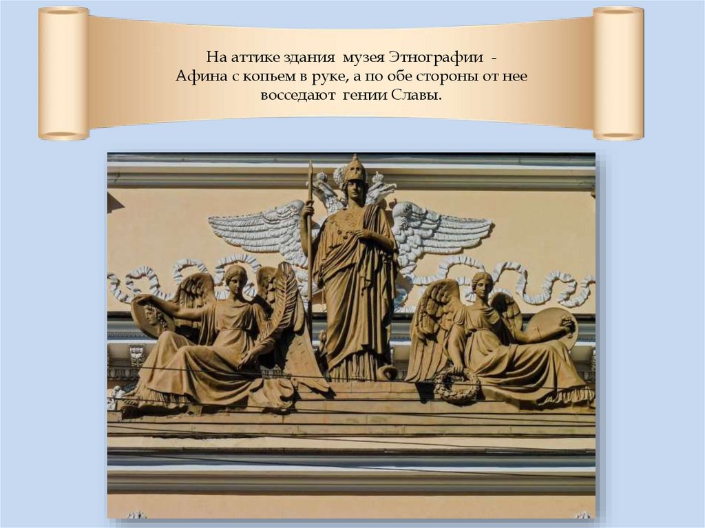 На аттике здания музея Этнографии Афина с копьем в руке, а по обе стороны от неевосседают гении Славы.