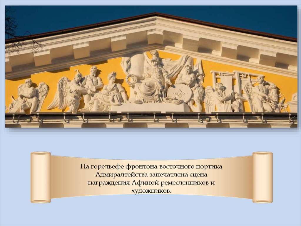На горельефе фронтона восточного портикаАдмиралтейства запечатлена сцена