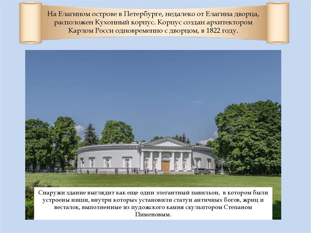 На Елагином острове в Петербурге, недалеко от Елагина дворца,расположен Кухонный корпус. Корпус создан архитектором