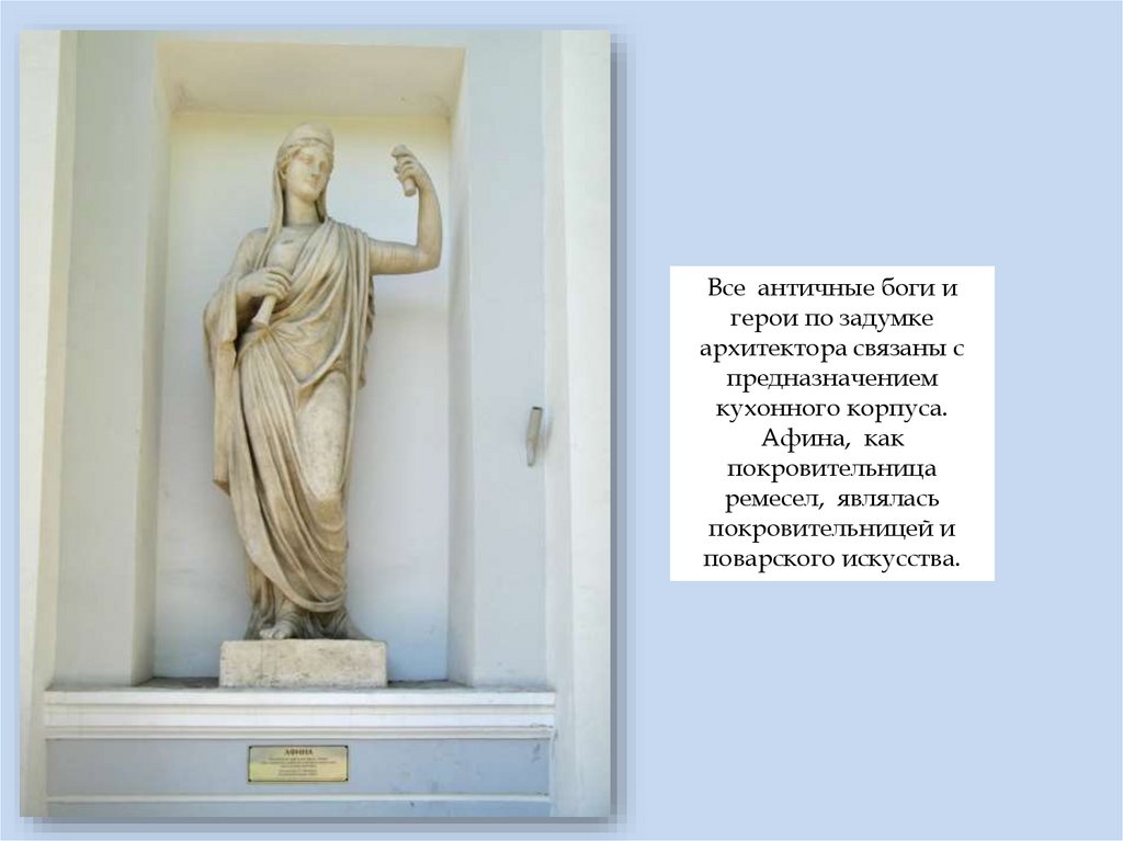 устроены ниши, внутри которых установили статуи античных богов, жриц и