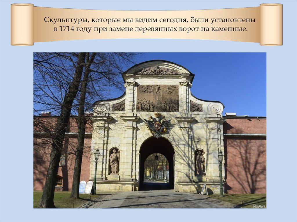 Скульптуры, которые мы видим сегодня, были установленыв 1714 году при замене деревянных ворот на каменные.