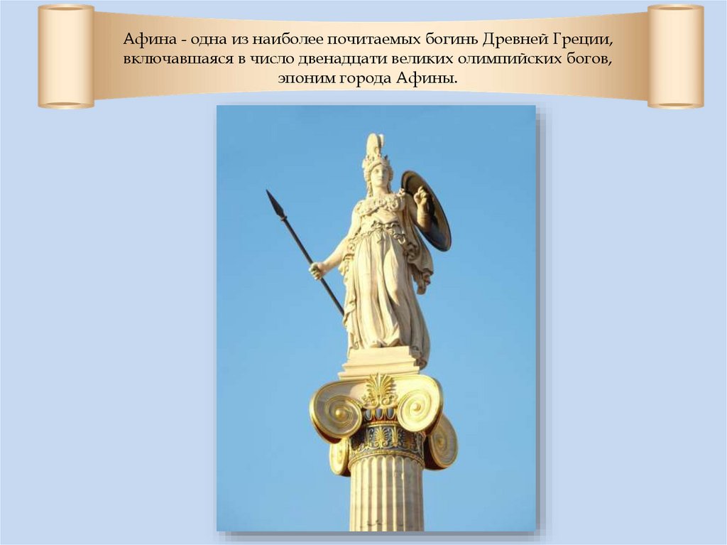 Афина - одна из наиболее почитаемых богинь Древней Греции,включавшаяся в число двенадцати великих олимпийских богов,