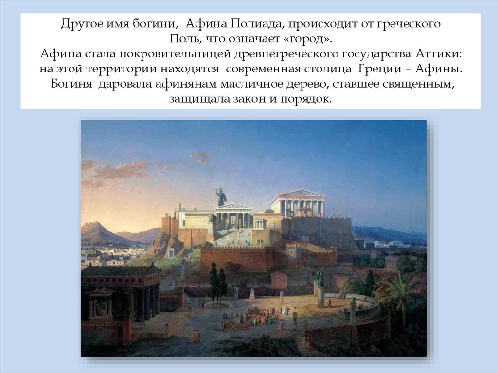 Другое имя богини, Афина Полиада, происходит от греческогоПоль, что означает «город».