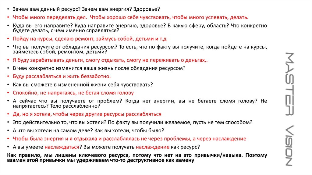 • Зачем вам данный ресурс? Зачем вам энергия? Здоровье?• Чтобы много переделать дел. Чтобы хорошо себя чувствовать, чтобы много успевать, делать.