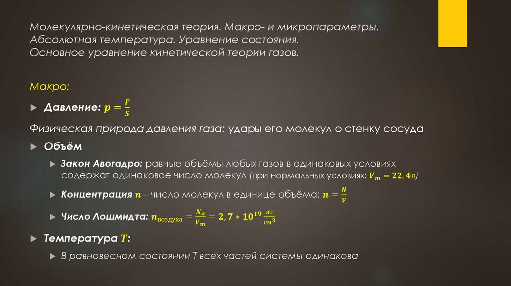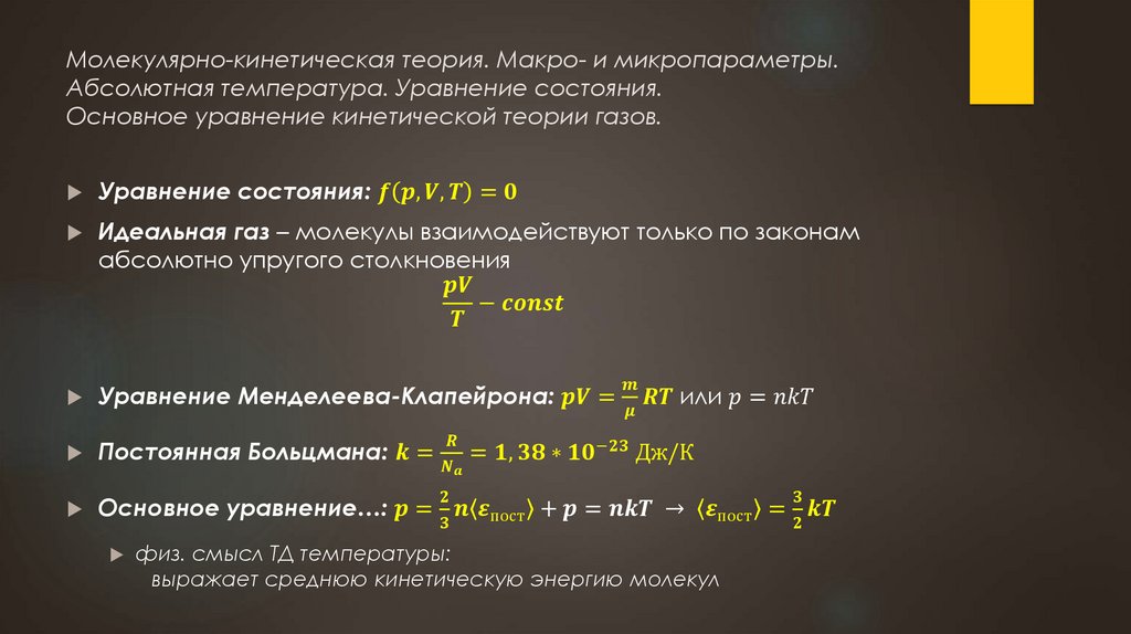 Молекулярно-кинетическая теория. Макро- и микропараметры.Абсолютная температура. Уравнение состояния.