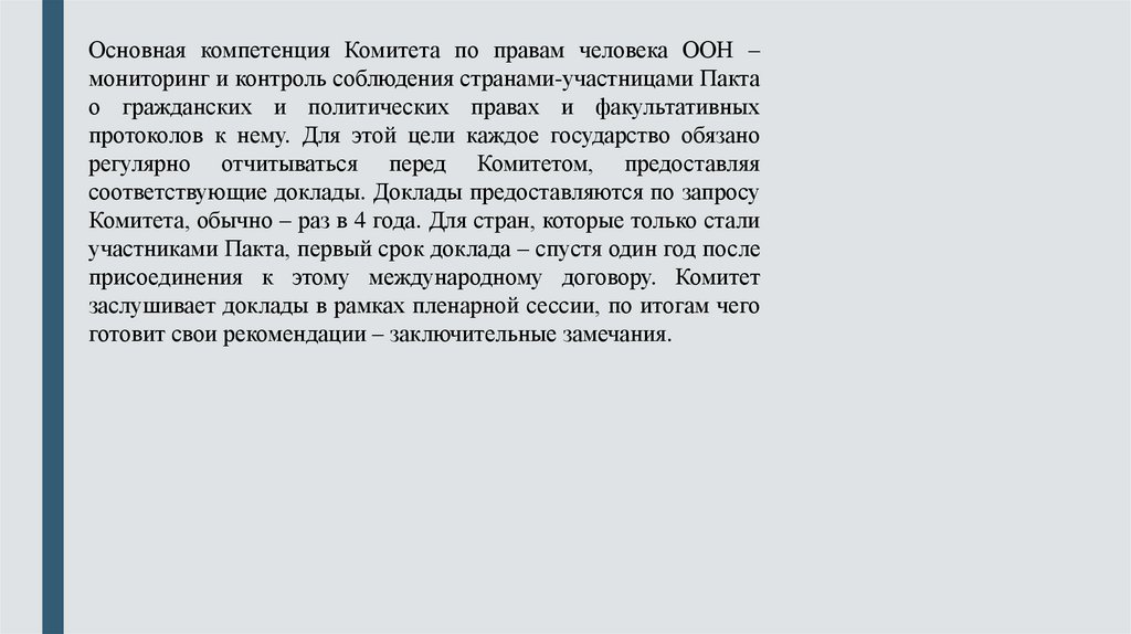 Основная компетенция Комитета по правам человека ООН –мониторинг и контроль соблюдения странами-участницами Пакта