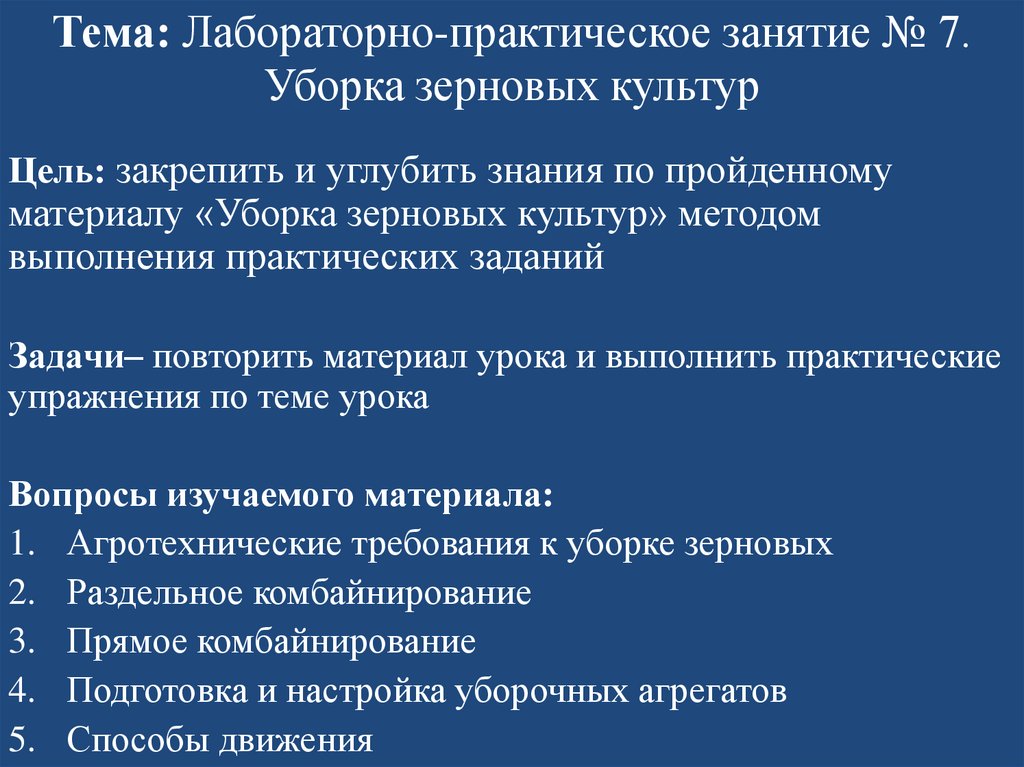 Тема: Лабораторно-практическое занятие № 7.Уборка зерновых культур