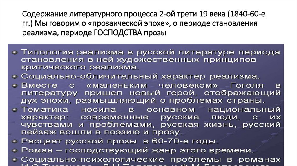 Содержание литературного процесса 2-ой трети 19 века (1840-60-егг.) Мы говорим о «прозаической эпохе», о периоде становления