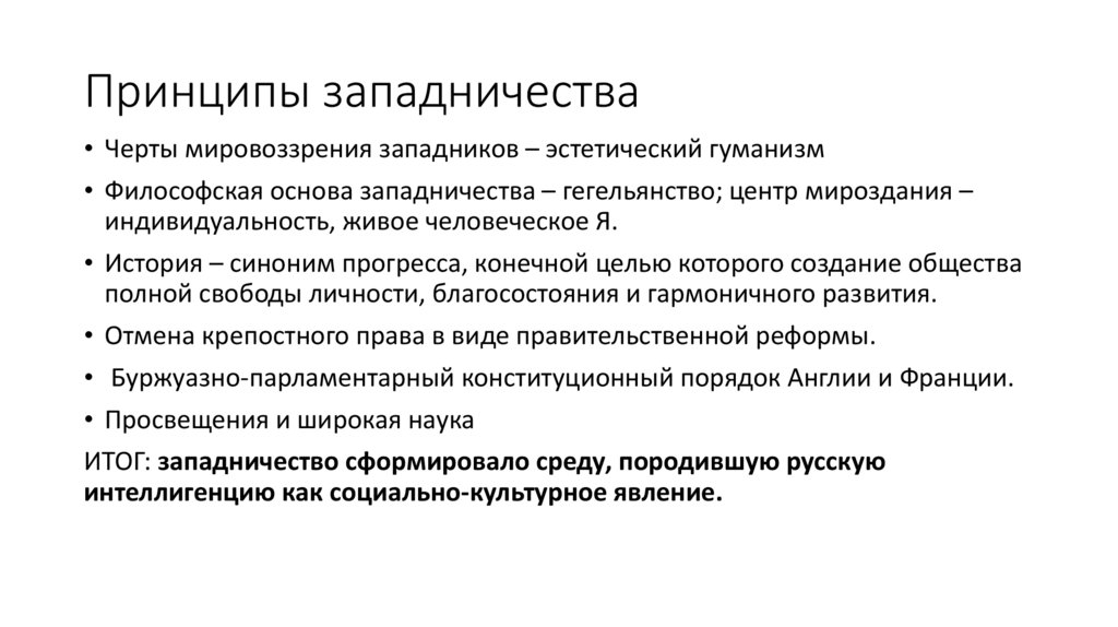 Принципы западничества• Черты мировоззрения западников – эстетический гуманизм