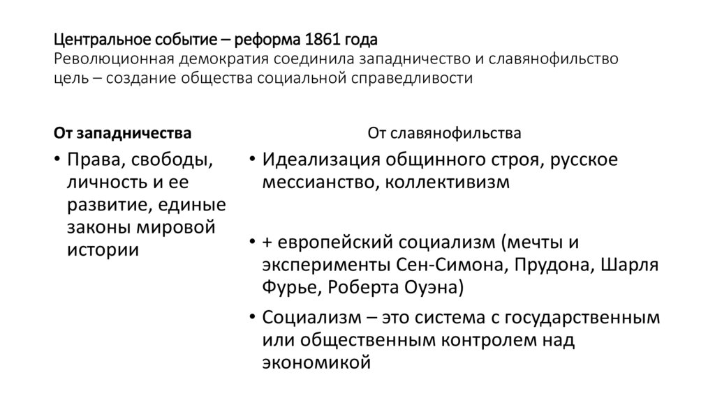 Центральное событие – реформа 1861 годаРеволюционная демократия соединила западничество и славянофильство