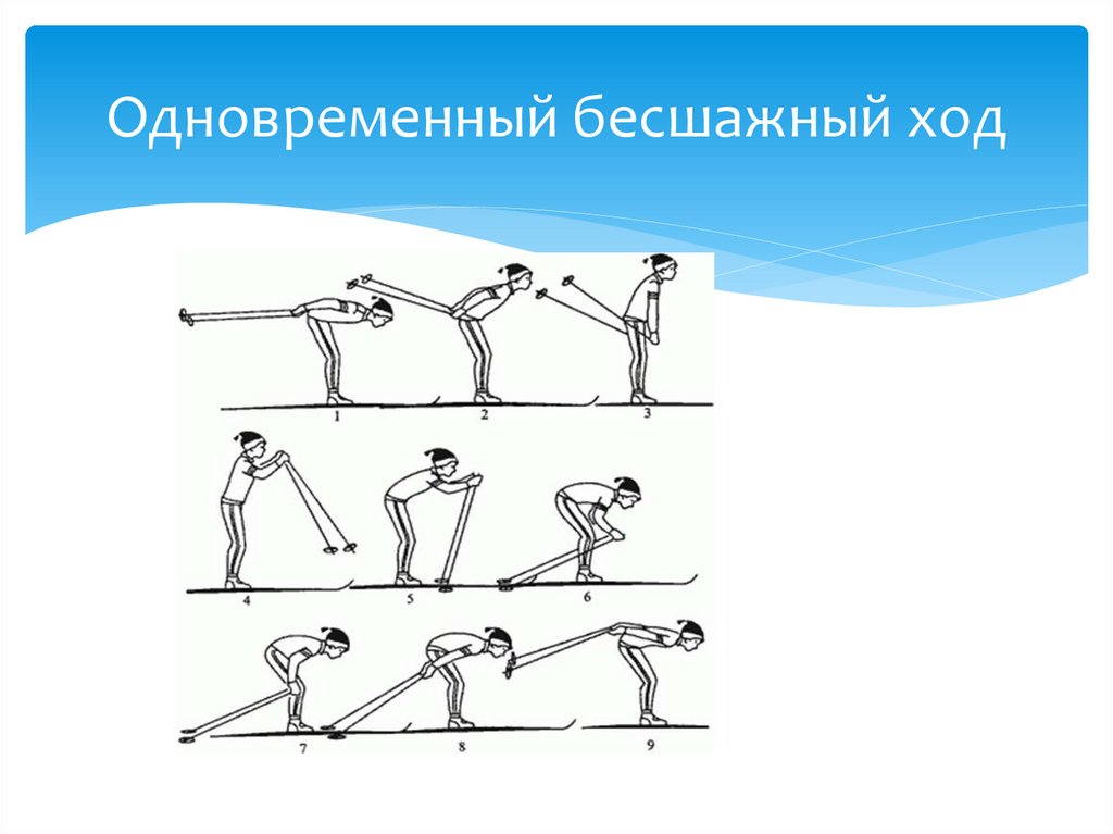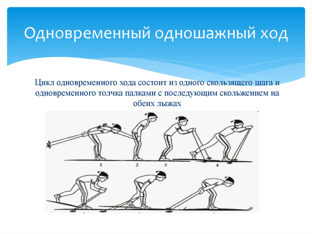 Одновременный одношажный ходЦикл одновременного хода состоит из одного скользящего шага и