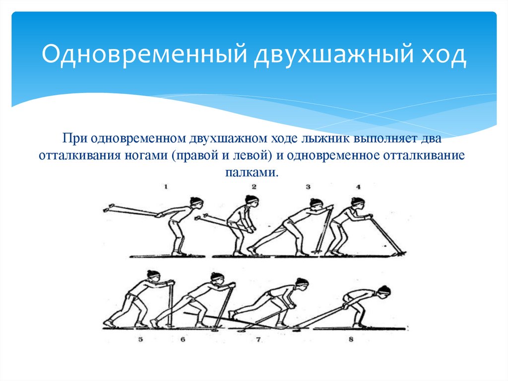 Одновременный двухшажный ходПри одновременном двухшажном ходе лыжник выполняет два