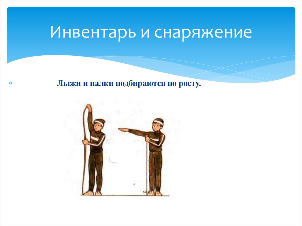 Инвентарь и снаряжениеЛыжи и палки подбираются по росту.