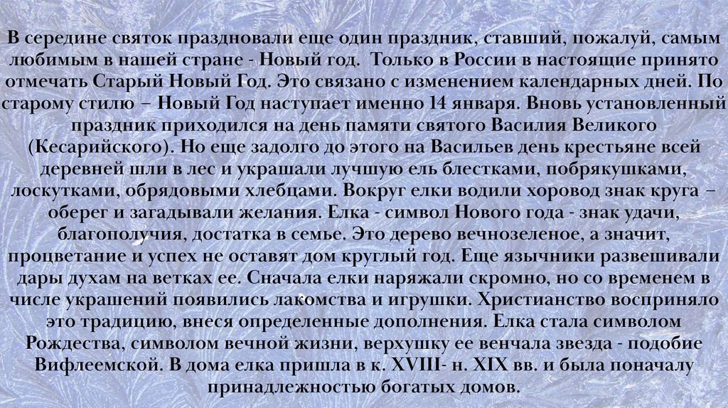 В середине святок праздновали еще один праздник, ставший, пожалуй, самымлюбимым в нашей стране - Новый год. Только в России в настоящие принято