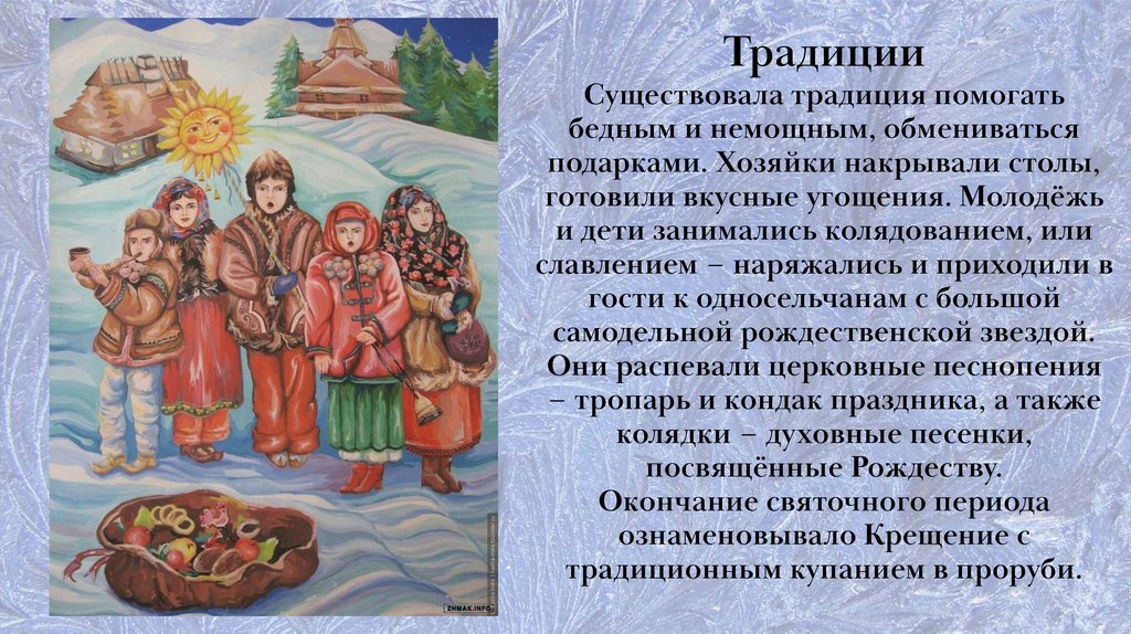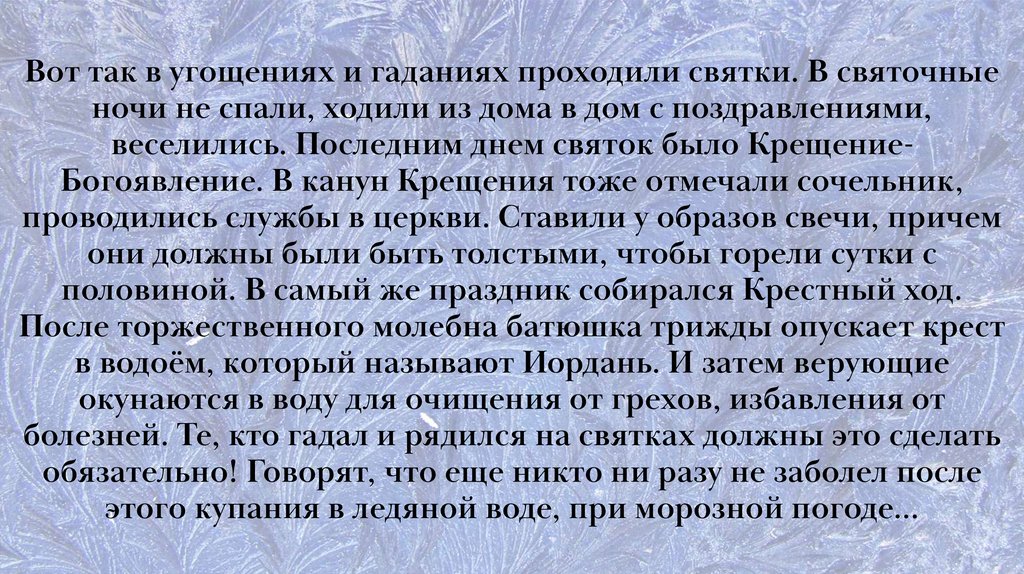 веселились. Последним днем святок было КрещениеБогоявление. В канун Крещения тоже отмечали сочельник,