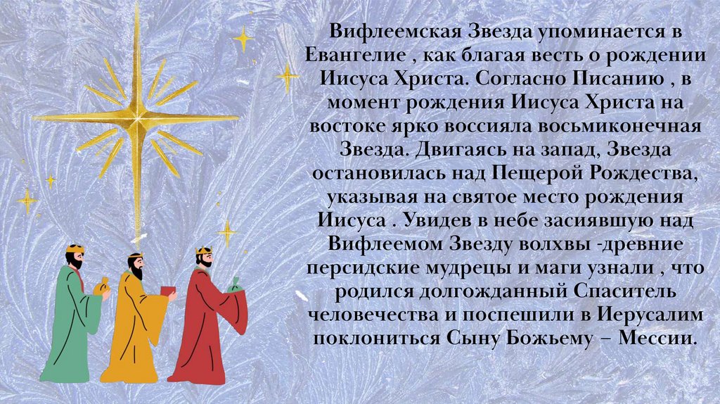 Вифлеемская Звезда упоминается вЕвангелие , как благая весть о рождении