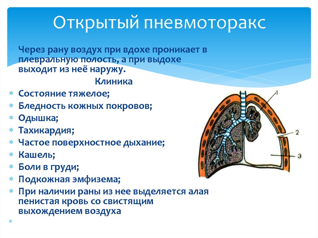 Открытый пневмотораксЧерез рану воздух при вдохе проникает в