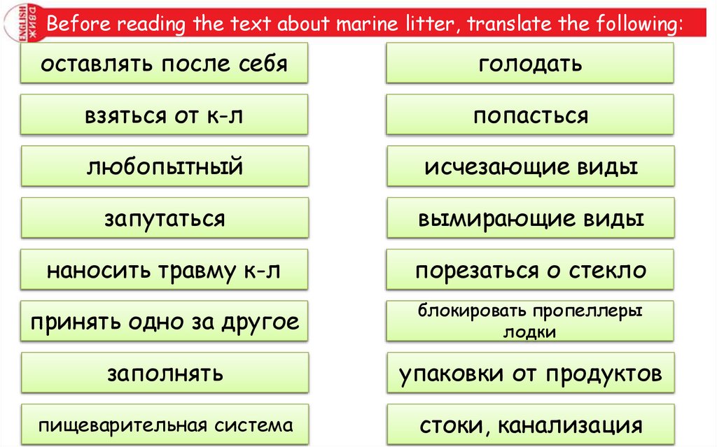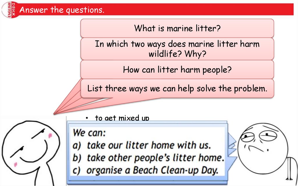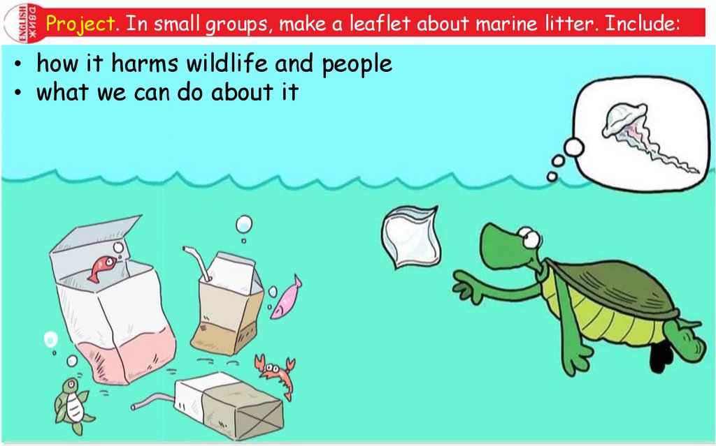Project. In small groups, make a leaflet about marine litter. Include:• how it harms wildlife and people
